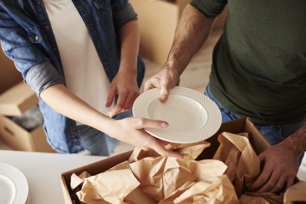 Wrap plates in bubble wrap and pack with crumpled packing paper on the bottom of the dish pack box as well as the top to avoid damage. Be careful not to overpack the box!